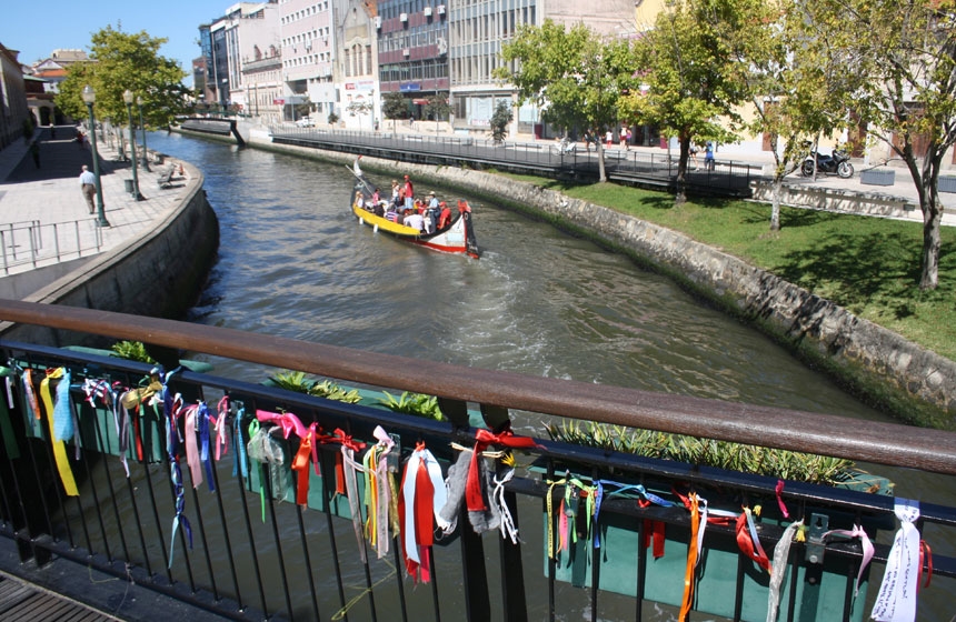 Subirse a un moliceiro es la mejor forma de conocer esta pintoresca urbe. Lo habitual es tomar una de estas embarcaciones en la plaza de Humberto Delgado y recorrer sus cuatro principales canales, llamados: de las Pirámides, Central, de los Santos Mártires y de San Roque, y observar sus emblemáticos edificios y sus puentes tan curiosos, alguno de ellos recordarno notablemente a los de Venecia.