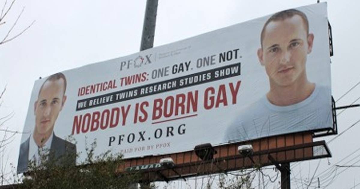 Creemos que los estudios de investigación sobre los gemelos muestran que nadie nace gay", afirma el anuncio, pagado por la organización Parents and Friends of Ex-Gays (PFOX).