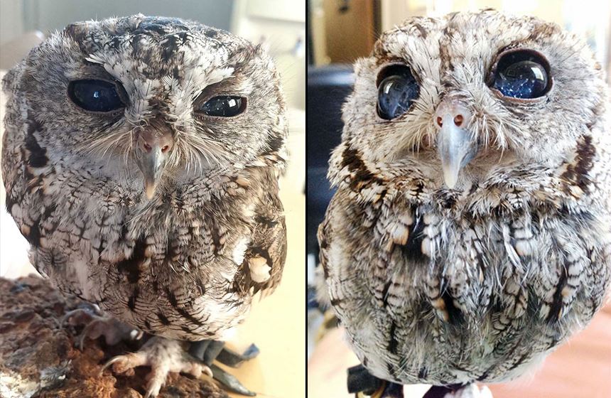 En el refugio para animales, un oftalmólogo diagnosticó al animal conjuntivitis, degeneración corneal, endoteliopatía y uveítis. No había solución, el búho mantendría únicamente un 10% de visión.