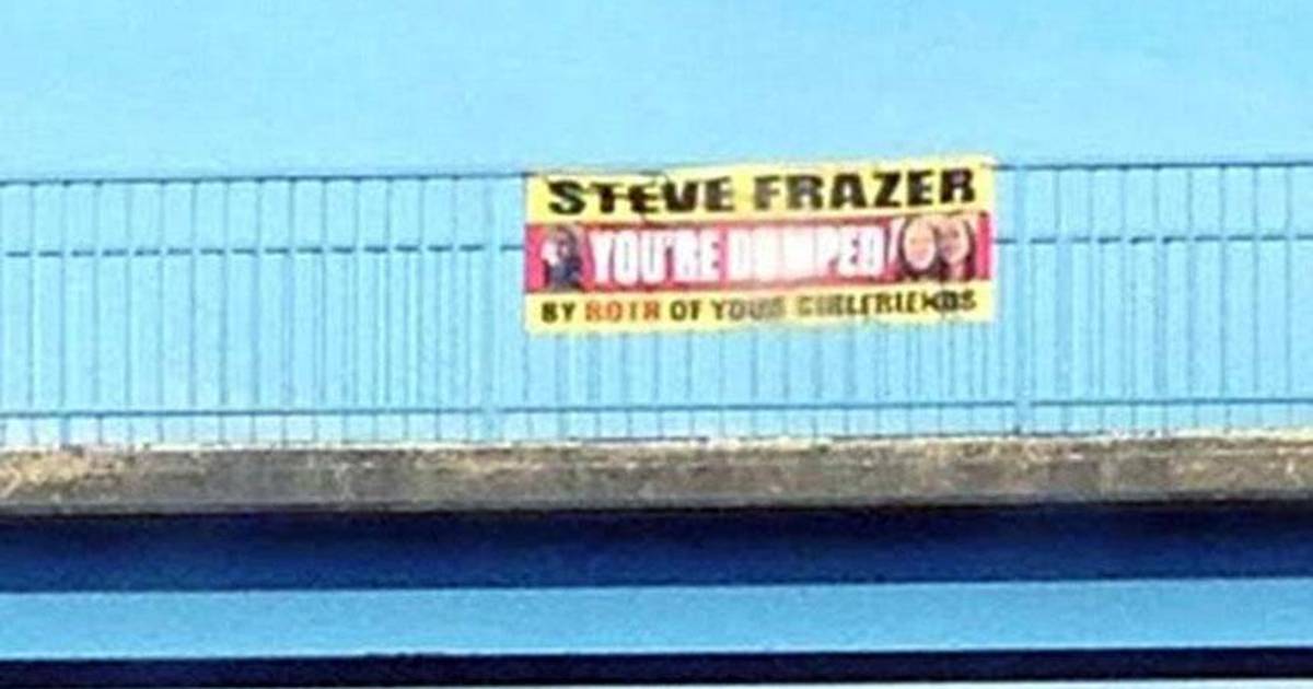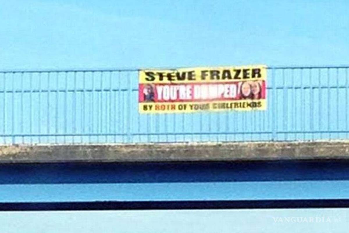 En la pancarta se lee Steve Frazer te dejamos tus dos novias, acompañado por una foto de él y una de las chicas juntas. Este mensaje fue leído por miles de personas que transitaron por aquel sitio durante la mañana.