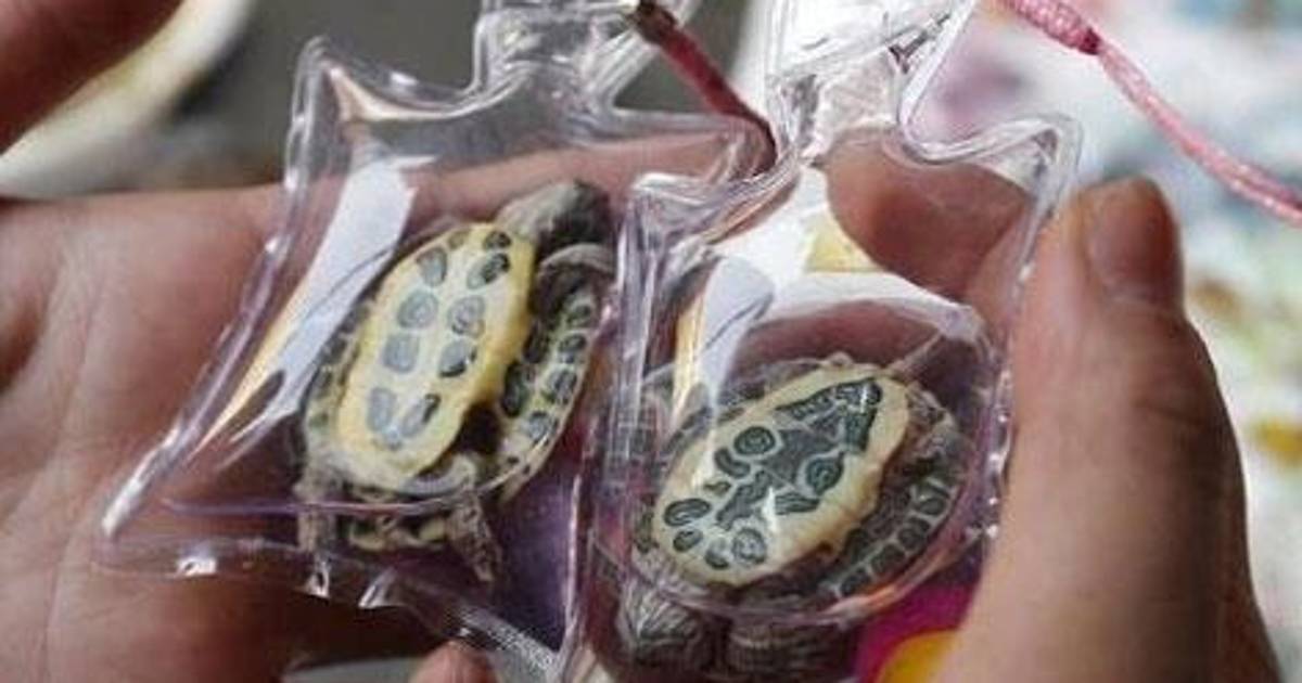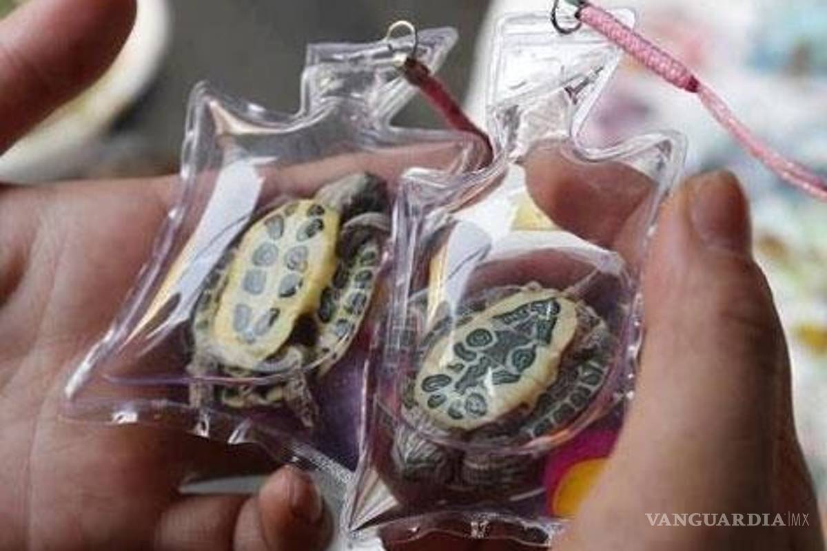 Tortugas, peces y salamandras, entre otros son encerrados al vacío para confeccionar este adorno.