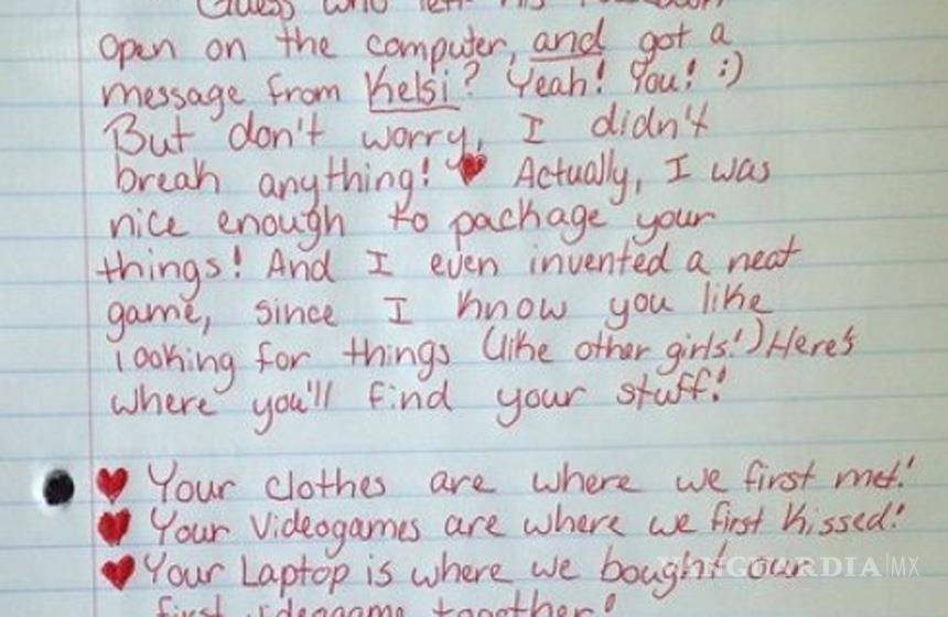"Hey cariño, Adivina quién dejó su Facebook abierto y tenía un mensaje de Kelsi? Sí! Tú! :) Pero no te preocupes, no he roto nada. De hecho, he sido lo suficientemente linda como para empaquetar todas tus cosas e, incluso, he inventado un juego, ya que sé que te encanta buscar cosas como otras chicas! Aquí encontrarás todas tus cosas:
