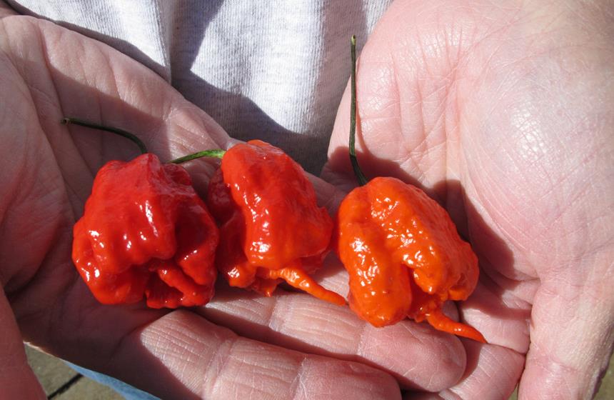Ed Currie es el poseedor del récord mundial por haber creado el "Carolina Reaper". El tallo de estos frutos parece la cola de un escorpión. En el otro extremo está la fruta roja, cuya concentración de picor es casi la misma de la mayoría de los aerosoles de chile que utiliza la policía norteamericana.