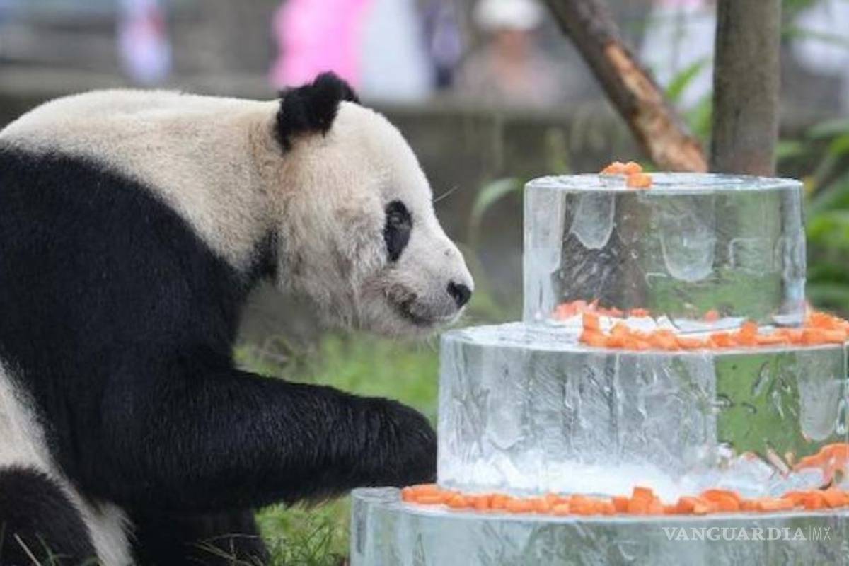Los cuidadores y visitantes cantaron el cumpleaños feliz a Pan Pan, que como regalo recibió una escultura de hielo con tres grandes zanahorias.