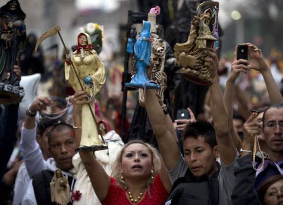 Su devoción obedece a la precariedad en la que viven millones de personas y, en el caso de México, a la guerra contra el narco de Felipe Calderón, y en la que murieron 70 mil mexicanos. Ante el miedo, la desesperación y la inseguridad que se vive en el país, muchas personas, además de los narcotraficantes, le piden protección.
