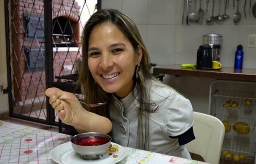 Meneghel Carolina Tanaka, de 29 años, quien a pesar de las adversidades de vivir sin sus extremidades superiores, terminó su carrera en educación física en 2007 y en abril de 2014 aprobó un concurso público para impartir clases en la municipalidad de Piracicaba, estado de Sao Paulo, donde vive con su familia.