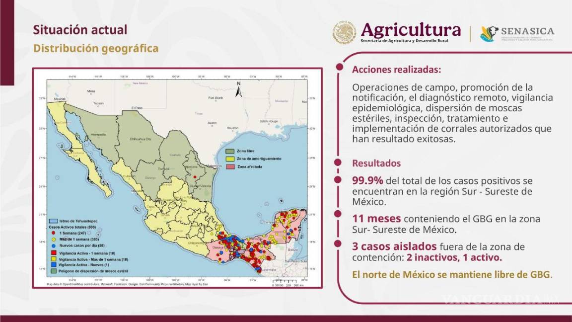 El plan de acción de APHIS-SENASICA para el control de la plaga se firmó el 19 de agosto de 2025, bajo compromisos asumidos por México y Estados Unidos para controlar la movilización animal y el riesgo del GBG. Las estrategias clave son: inspección, control en el traslado de hatos y reforzamiento de barridos sanitarios.