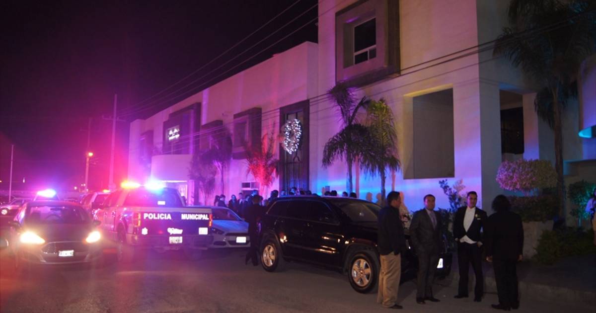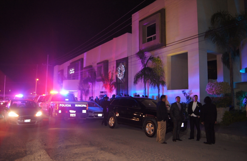 Al menos 10 policías cerraron la calle Río de Janeiro entre Chihuahua y bulevar Madero de la colonia Guadalupe y otros dos custodiaron el acceso al recinto, mientras los invitados permanecían en las banquetas, esperando información.