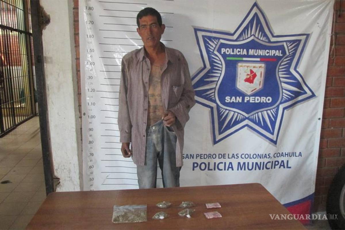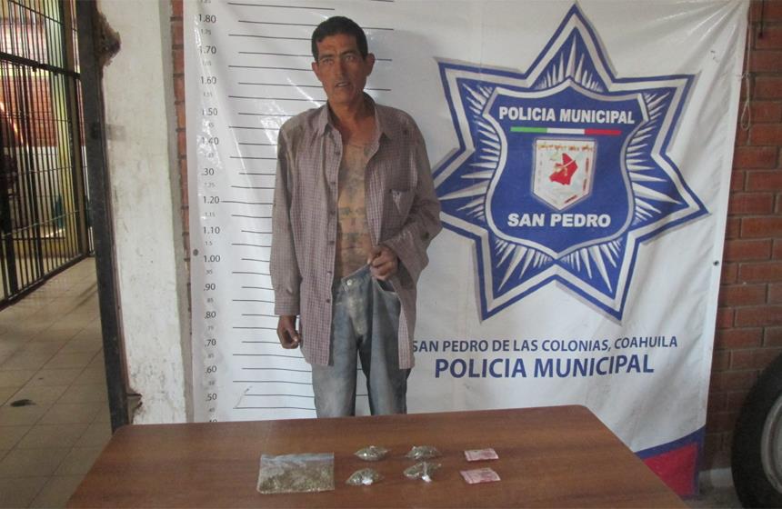 San Pedro, Coah. Policías municipales detuvieron en la colonia Las Margaritas en San Pedro a un vendedor de droga en poder de cuatro dosis de marihuana y que además traía semilla del vegetal en una bolsa de plástico, así como cien pesos en dos billetes de 50.