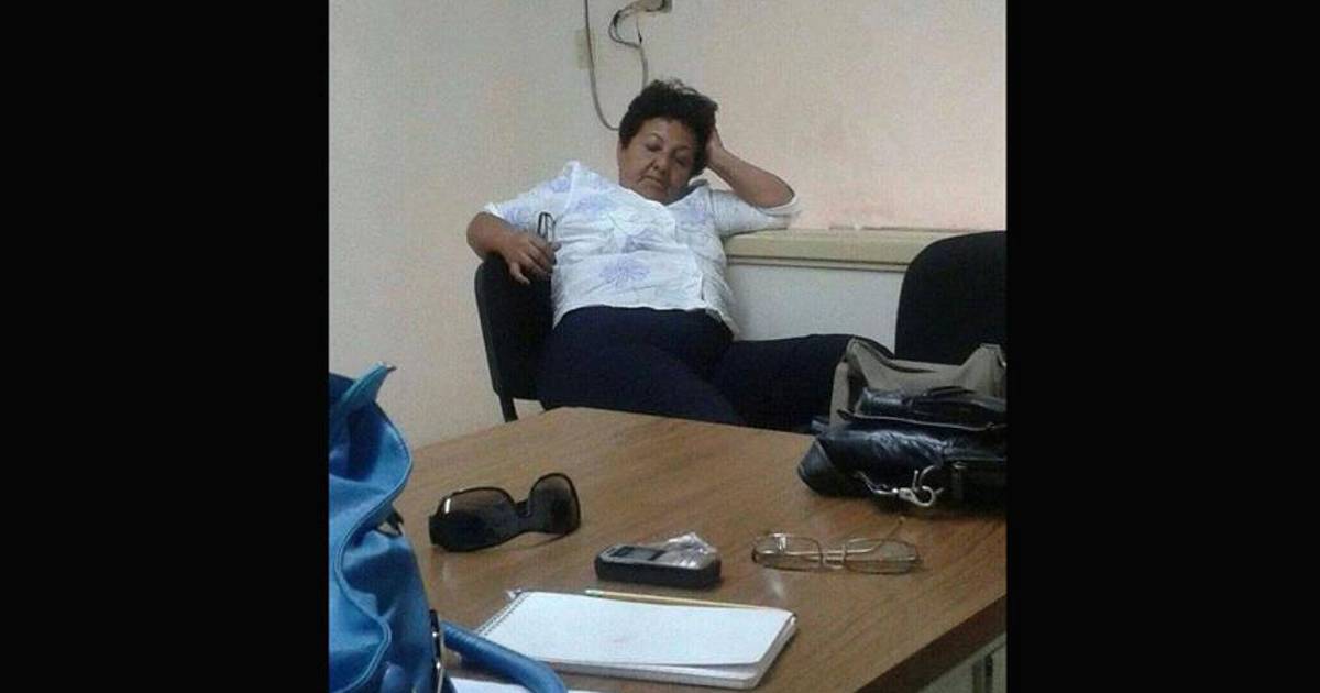 Otra imagen muestra a otra trabajadora que viste blusa blanca y pantalón negro, dormida placenteramente sobre una silla que se encuentra en la propia oficina.