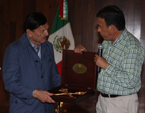 Reunidos en instalaciones de un hotel de este municipio, el Gobernador entregó las Llaves del Estado de Coahuila al empresario, así como un Sarape con su nombre bordado.