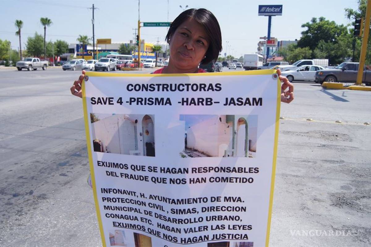 Monclova, Coahuila. Sobre los bulevares Harol R. Pape y Francisco I Madero, un grupo de vecinos del Fraccionamiento el Campanario se manifestaron contra el Infonavit y las constructoras responsables de edificar las viviendas que hoy representan un peligro para 300 de familias.