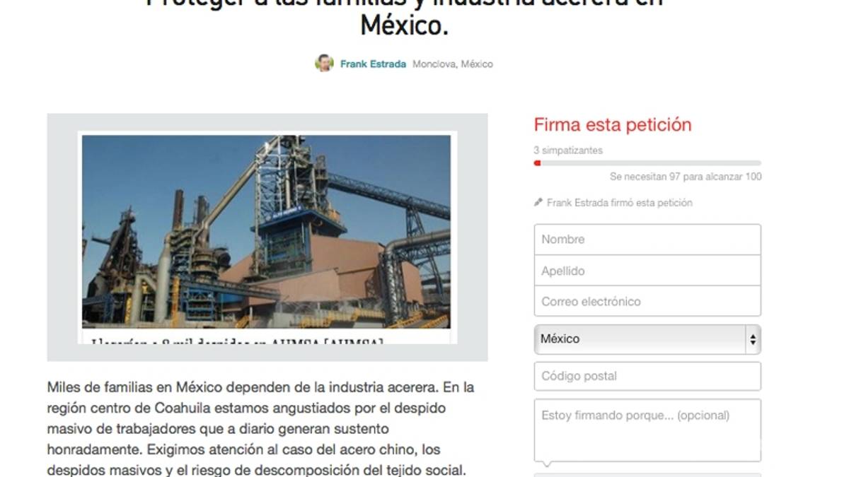 La petición que lleva el nombre Proteger a las familias e industria acerera en México está dirigida al titular de la Secretaría de Economía, Ildefonso Guajardo; al presidente de México, Enrique Peña Nieto y al secretario de Gobernación, Miguel Ángel Osorio Chong