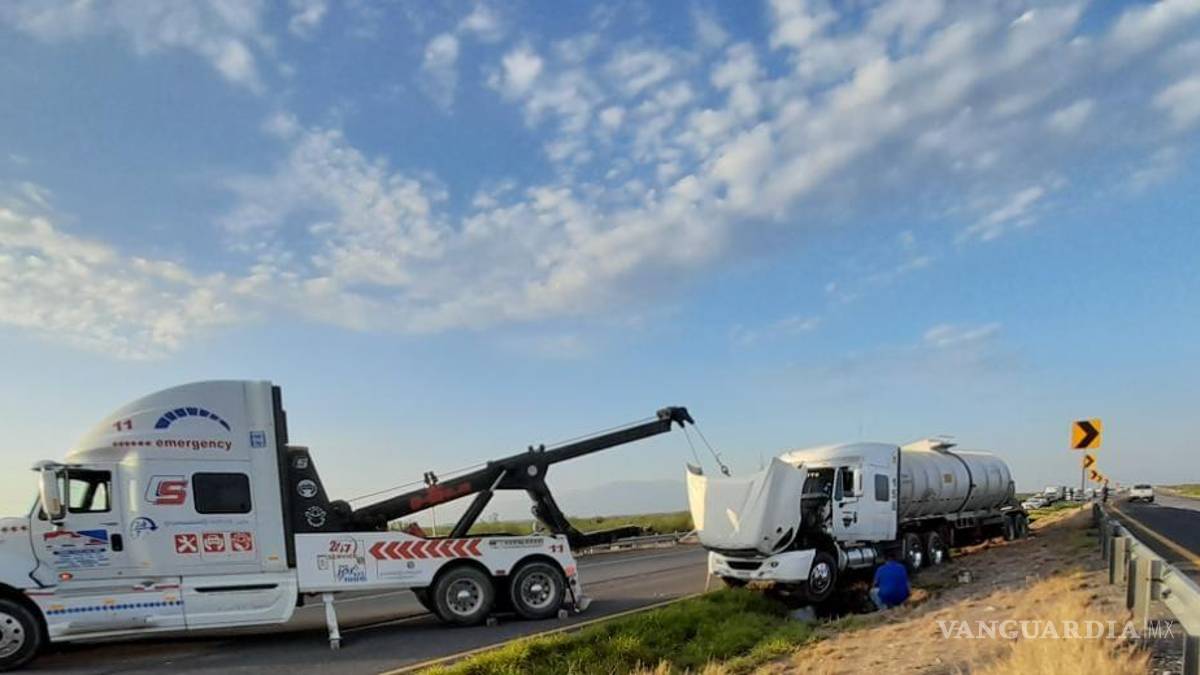 Por horas quedó cerrada la Carretera Federal 57, a la altura de Estación Hermanas en la Escobedo, Coahuila, luego de que un tráiler que transportaba 60 mil litros aceite contaminado saliera de la carretera y cayera a un costado de la vía.