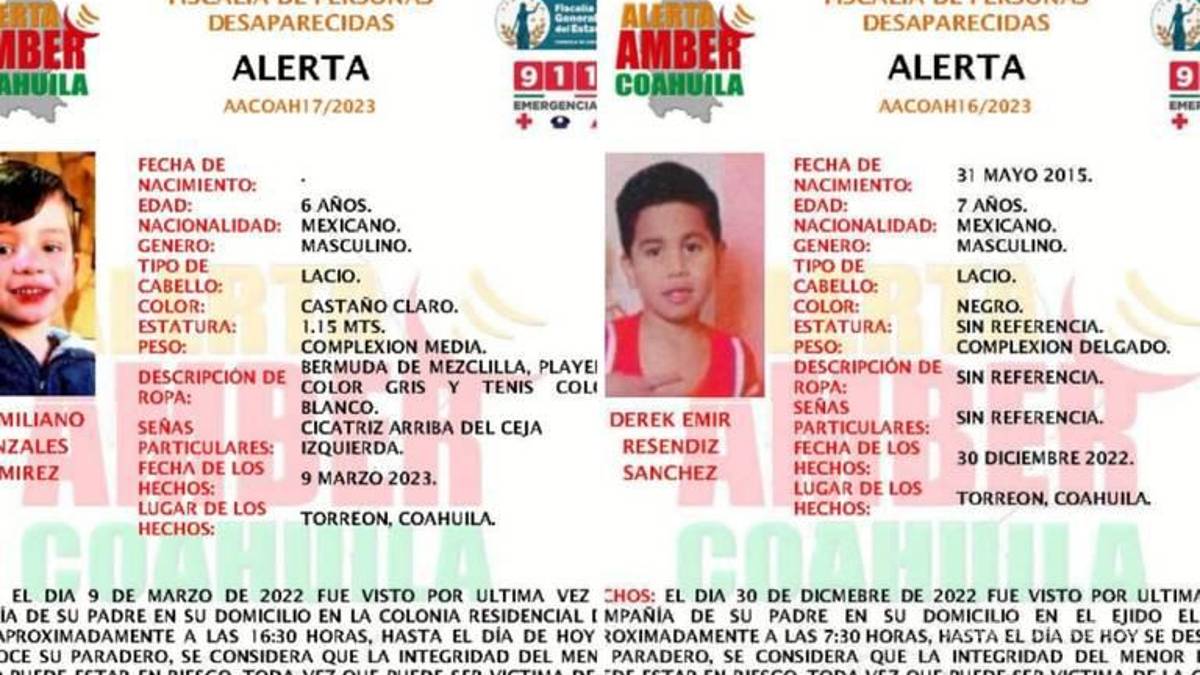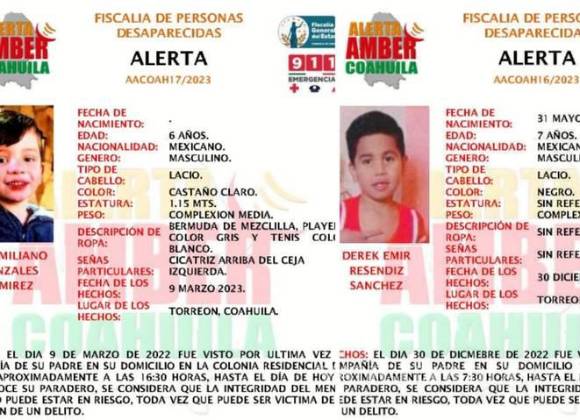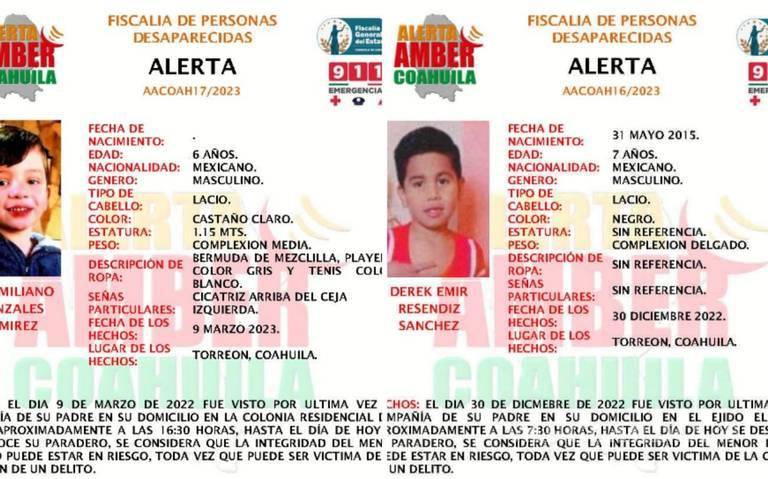 TORREÓN, COAH.- La Fiscalía de Personas Desaparecidas activó las fichas para localizar a dos niños que desaparecieron en Torreón, que, por tratarse de menores, también se lanzó la Alerta Amber