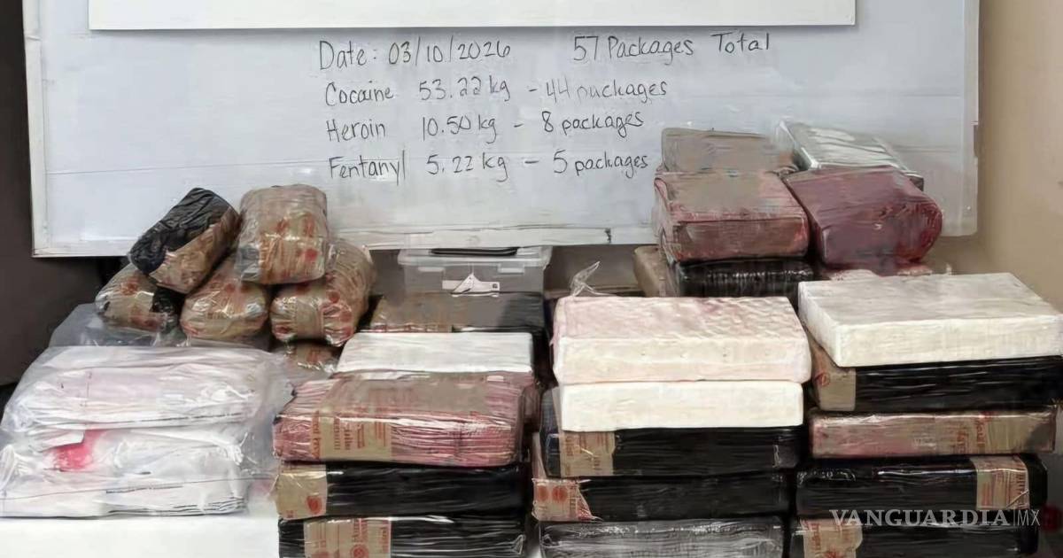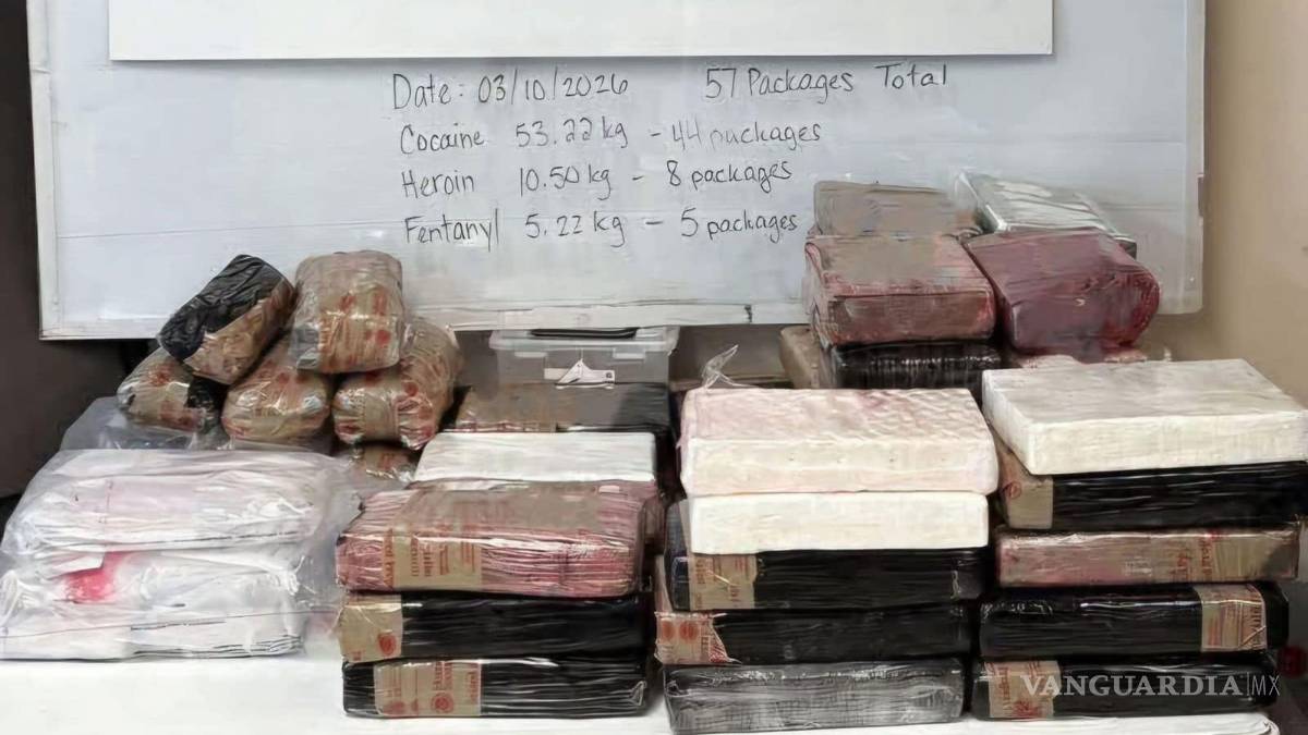 Al interior del vehículo, los agentes localizaron un cargamento oculto compuesto por diversas sustancias ilícitas. De acuerdo con el reporte oficial, fueron aseguradas 117.33 libras de presunta cocaína, 23.14 libras de supuesta heroína y 11.5 libras de presunto fentanilo, todas escondidas en compartimentos dentro de la camioneta.