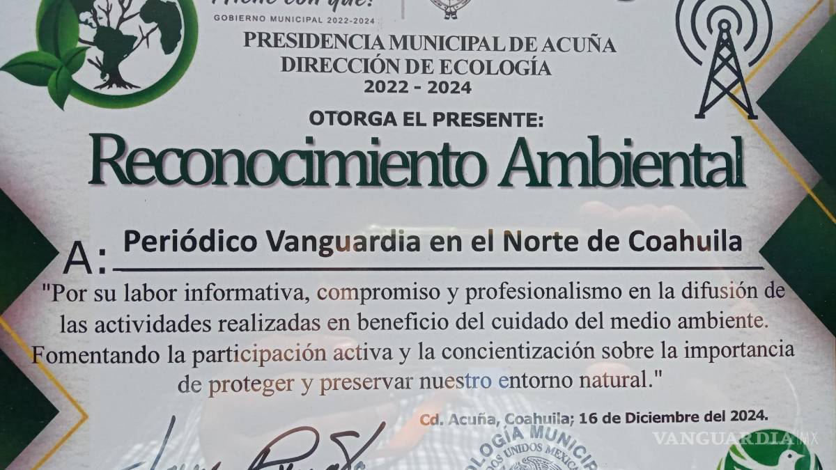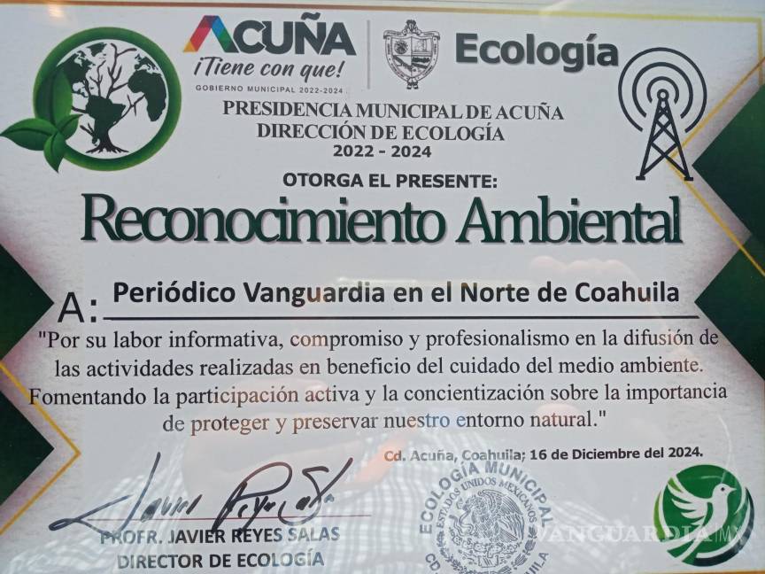 ACUÑA, COAH.- Por su contribución con el medio ambiente y ser un canal con la ciudadanía para difundir actividades con el medio ambiente, periódico VANGUARDIA recibió un reconocimiento de la Dirección Municipal de Ecología que encabeza el profesor, Javier Reyes Salas.