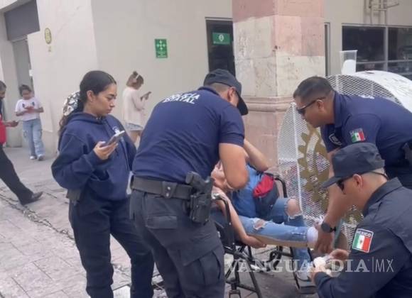 Personal de la Policía de Coahuila atendió a una mujer que sufrió una caída y se lesionó mientras caminaba alrededor de la Plaza de Armas la mañana de este jueves.