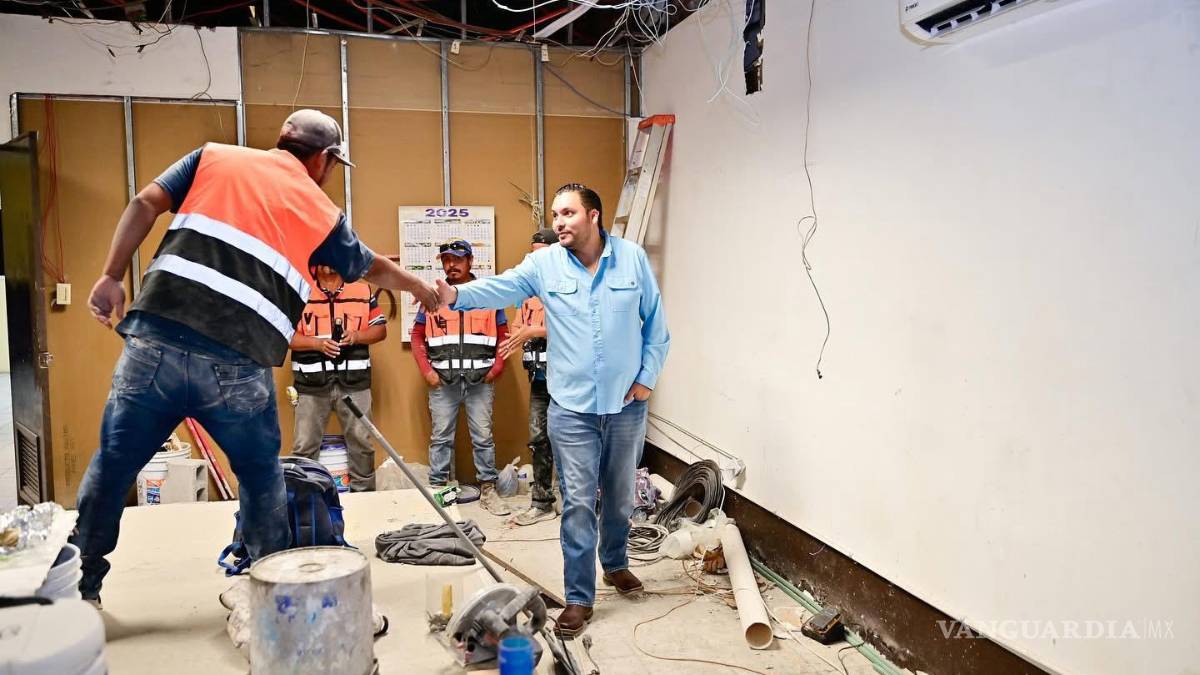 MONCLOVA, COAH.- Con el objetivo de revisar los avances de la obra de remodelación en el área del auditorio que se utilizará, de manera inicial, como Centro de Control y Comando (C2) para el monitoreo de cámaras urbanas, grupos de WhatsApp y comités de colonias, el alcalde Carlos Villarreal supervisó los avances de la obra.