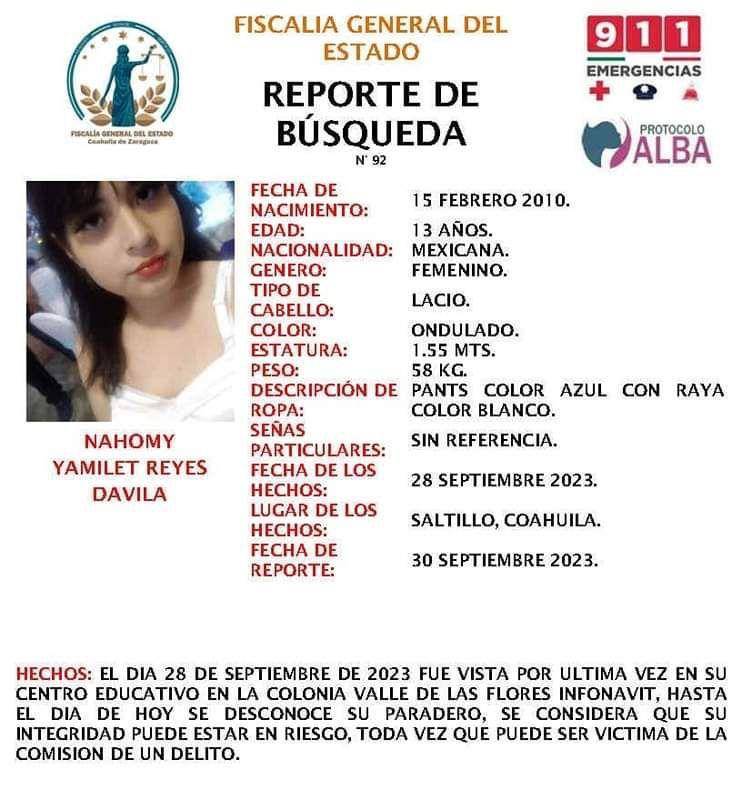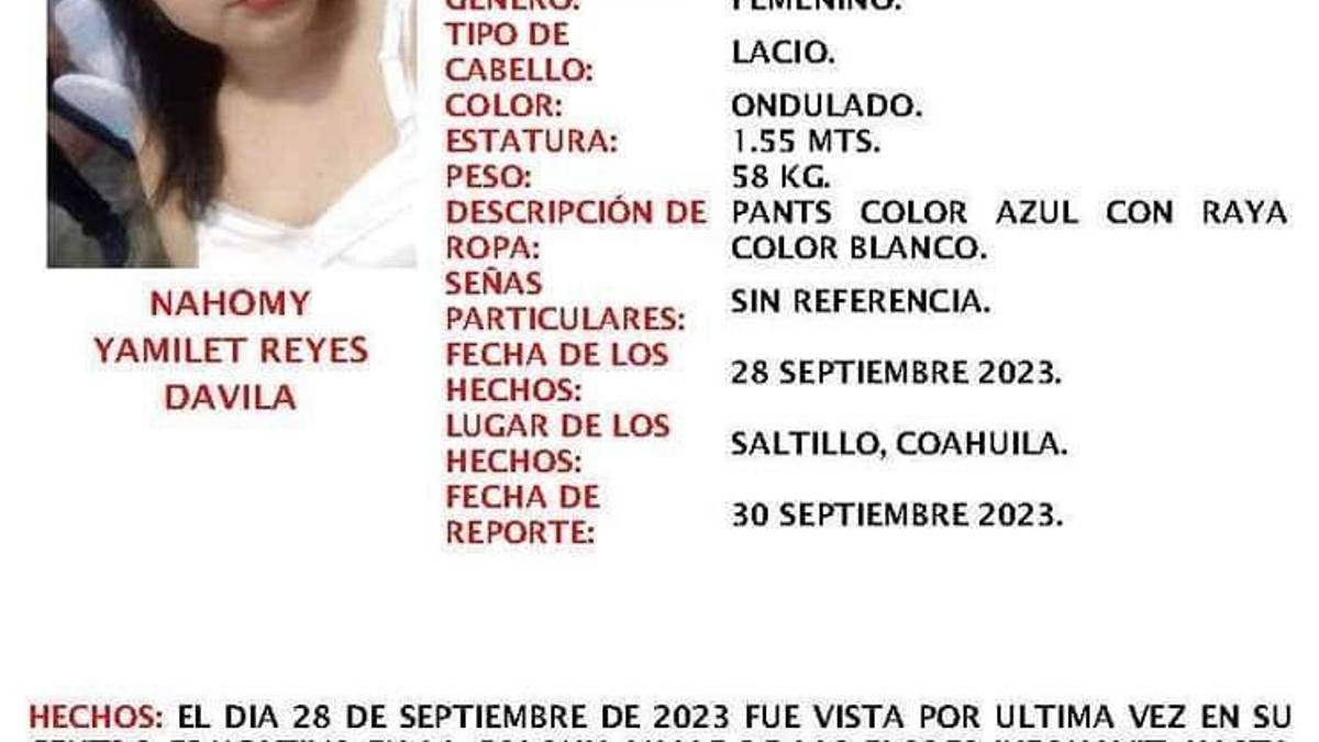 La última vez que se tuvo noticias de Nahomy Yamilet fue el 28 de septiembre en Saltillo. Salió de su casa en dirección a la escuela, donde fue vista por compañeros y maestros. Sin embargo, ese jueves no regresó a su hogar, lo que desató una búsqueda desesperada por parte de su madre y su familia. Se solicita la colaboración de la comunidad para encontrarla.