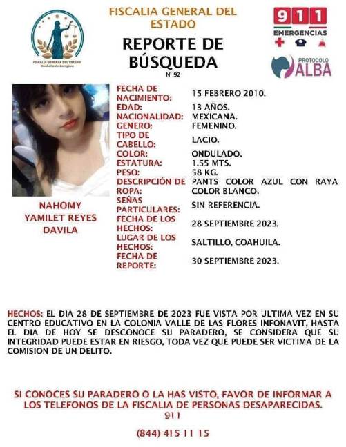 Ante cualquier información sobre Nahomy Yamileth, las autoridades piden contactarse a los teléfonos 911 o al 844 415 1115, o bien, mediante la página de Facebook Fiscalía de Personas Desaparecidas del Estado de Coahuila.