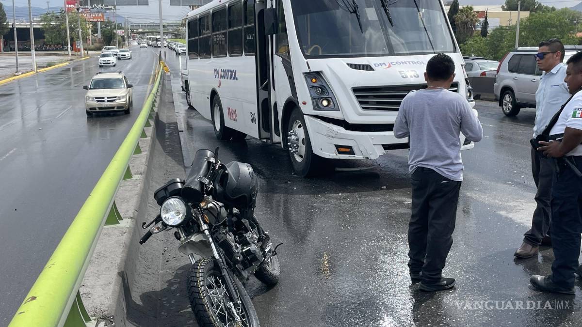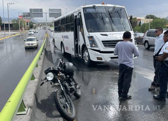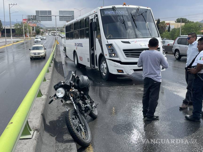 Saltillo, Coahuila.- Un motociclista por poco se encuentra con la muerte al ser embestido por un camión del servicio especializado en el bulevar Venustiano Carranza, frente a la colonia Real del Peña.