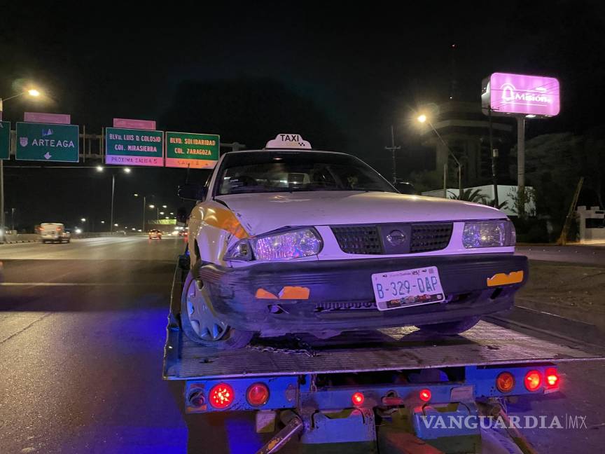 El conductor de un taxi perdió el control y terminó en un canal de desagüe en Saltillo junto con una pasajera cuando presuntamente una camioneta le cerró el paso y lo obligó a girar el volante, lo que resultó en el accidente.