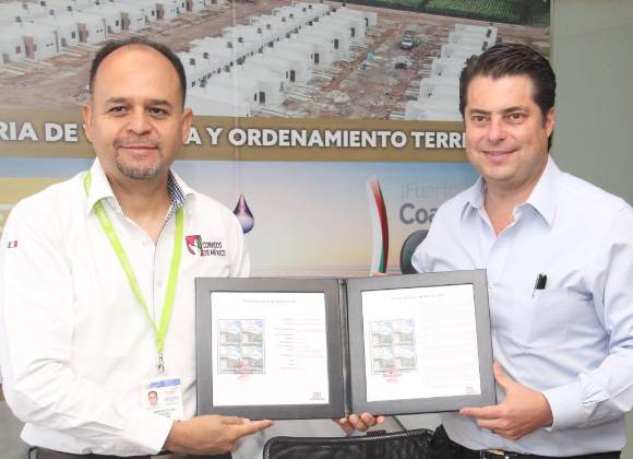 Enrique Martínez y Morales, secretario de Vivienda y Ordenamiento Territorial (Sevot), canceló la estampilla postal por el “75 aniversario del Banjército”, ante directivos del Servicio Postal Mexicano (Sepomex).
