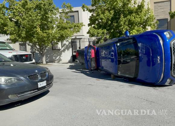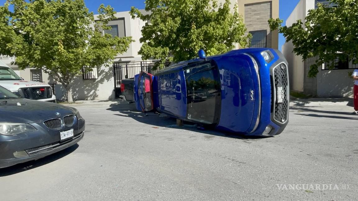 Una mujer terminó chocando una camioneta y volcando luego de salir de reversa de su domicilio en un fraccionamiento privado de Saltillo. Al conducir con chanclas, una de estas se le atoró y terminó por pisar el acelerador, lo que originó el accidente.