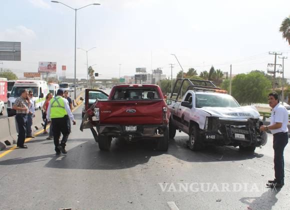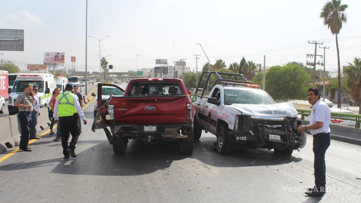 Una patrulla de tránsito municipal colisionó con una camioneta Ford Lobo en el puente vehicular del bulevar Venustiano Carranza y Pedro Figueroa. El oficial Pinales, al mando de la patrulla M1422, resultó herido y fue trasladado al Hospital Universitario de Saltillo.