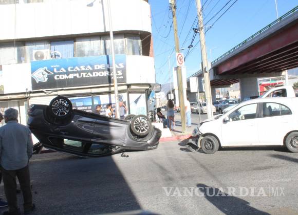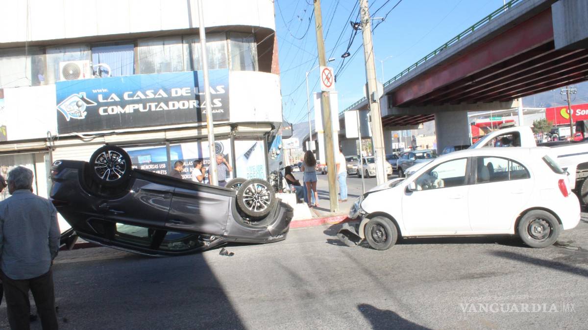 Un chofer de aplicación puso en peligro la vida de una pasajera al causar un choque con volcadura en el cruce del Periférico Luis Echeverría Álvarez y Abasolo, en la colonia Latinoamericana. Por fortuna, ninguno de los ocupantes resultó herido, aunque el accidente movilizó al personal de Tránsito Municipal de Saltillo, que tuvo que cerrar la circulación en el área.