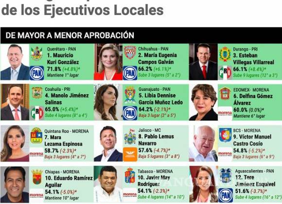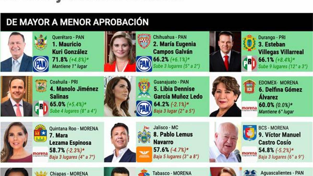 Enseguida, aparece el gobernador de Jalisco, Pablo Lemus Navarro (57.6 por ciento); de Baja California Sur, Víctor Manuel Castro Cosío (54.8 por ciento); y, en décimo lugar, el gobernador de Chiapas, Eduardo Ramírez Aguilar (54.1 por ciento).