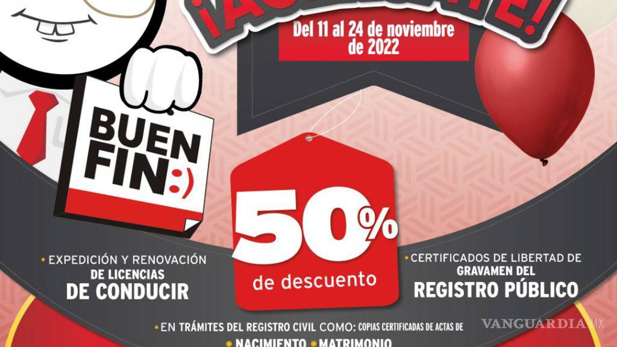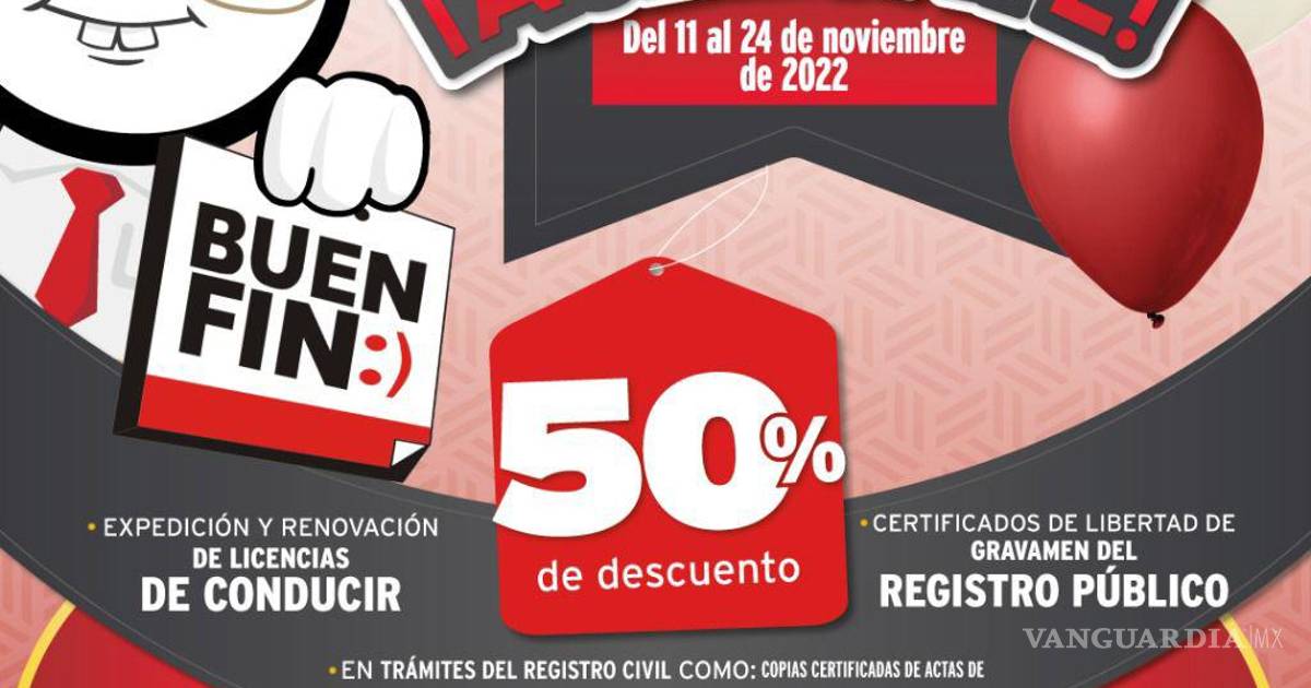 Sin embargo, el Buen Fin o descuentos de la Administración Fiscal General abarca también trámites como la escrituración, en donde se pagan desde mil 500 pesos con trámites directos ante la Secretaría de Vivienda y Desarrollo Territorial (Sevot) y la Comisión Estatal para la Regulación de la Tenencia de la Tierra Urbana y Rústica de Coahuila (Certturc); ahí el plazo se extiende hasta el 25 de noviembre.