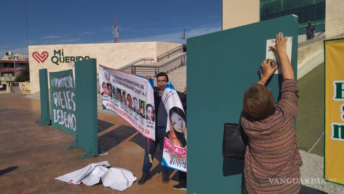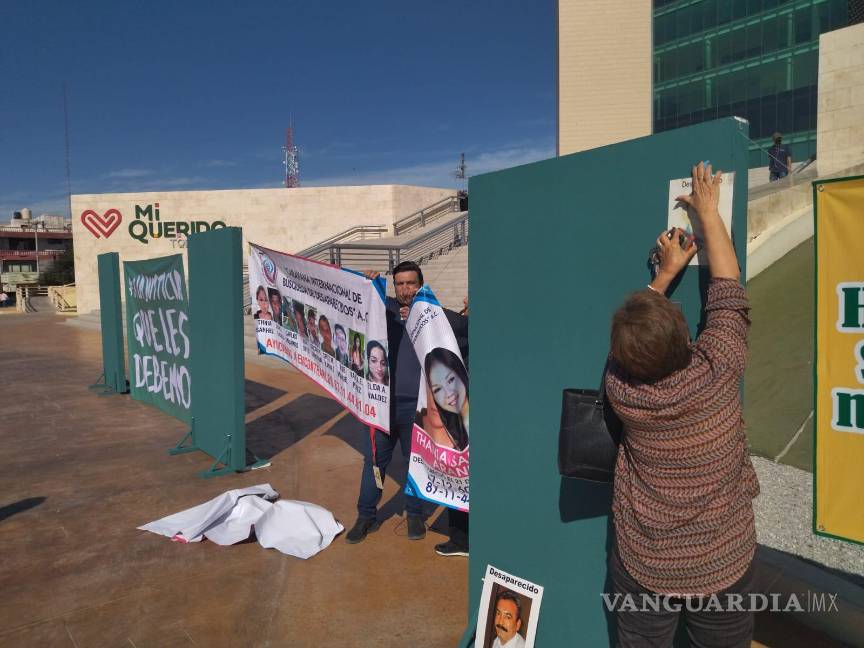 Colectivos de familias de personas desaparecidas en Torreón, se concentraron en la explanada de la Plaza Mayor para visibilizar los casos en el marco de la Muestra Nacional de Teatro en Torreón.