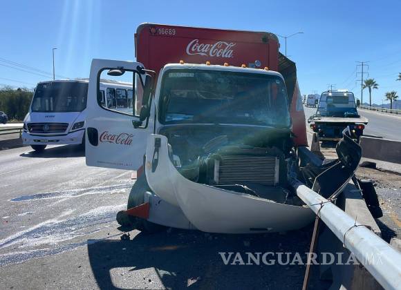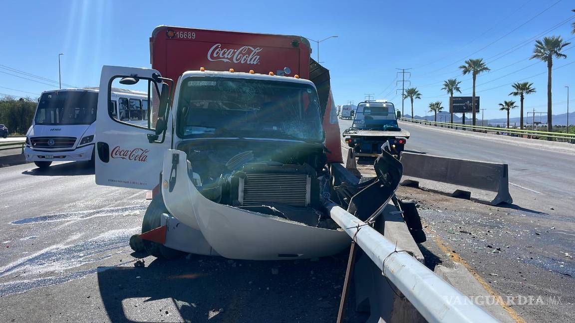 Debido al exceso de velocidad en el que circulaba, el conductor de un camión repartidor de refrescos de la empresa Coca-Cola terminó chocando contra los muros de contención en el bulevar Fundadores, al oriente de Saltillo.
