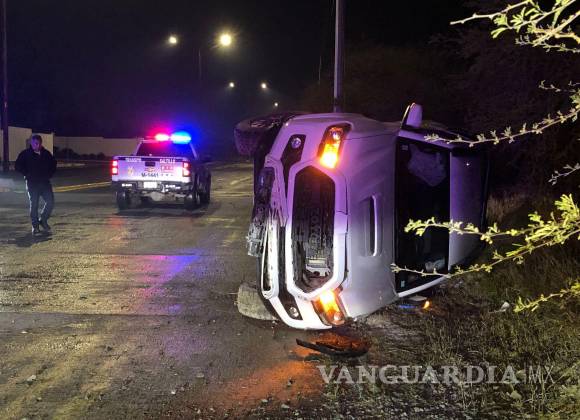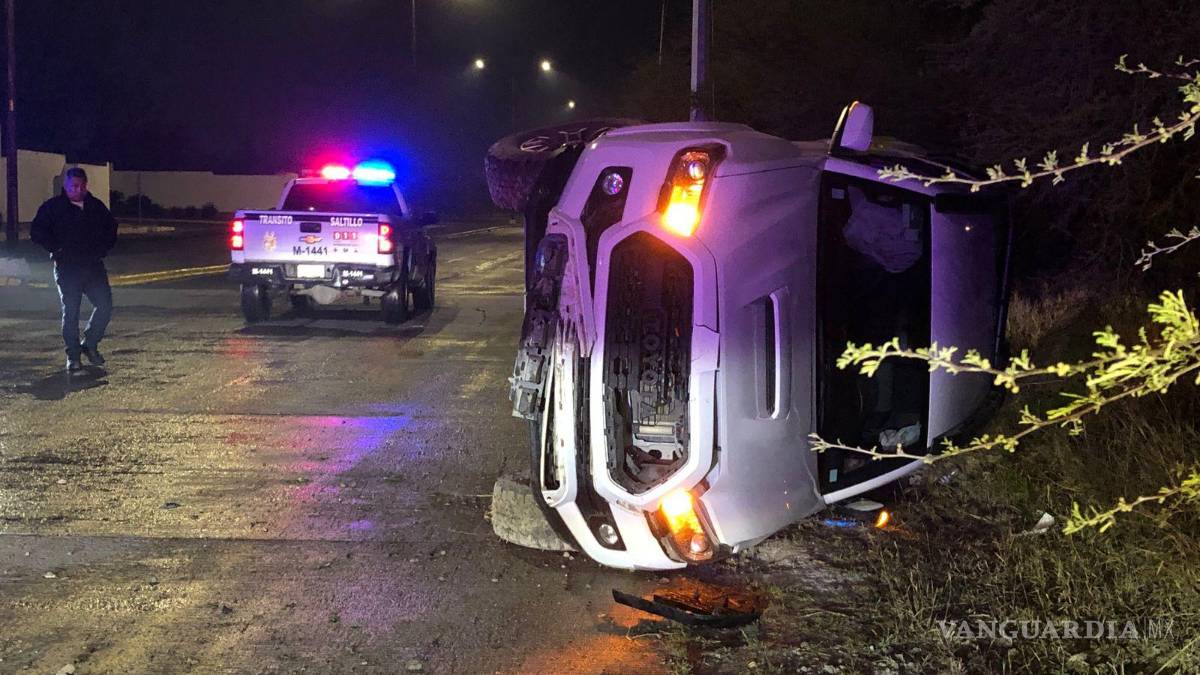 Una camioneta de la marca Toyota terminó volcada sobre su costado izquierdo, ya que, presuntamente, al tratar de esquivar otro vehículo, el conductor perdió el control del volante, lo que provocó el aparatoso percance vehicular al norte de Saltillo.