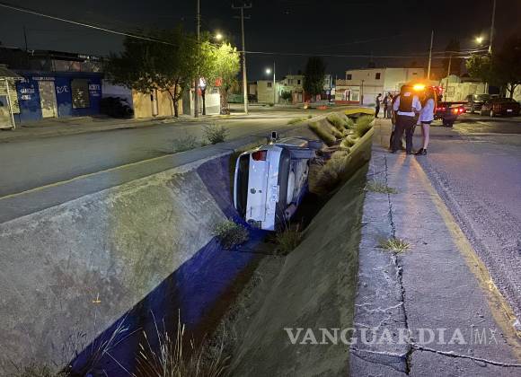 Conductor dormita y se vuelca en canal de desagüe en Saltillo
