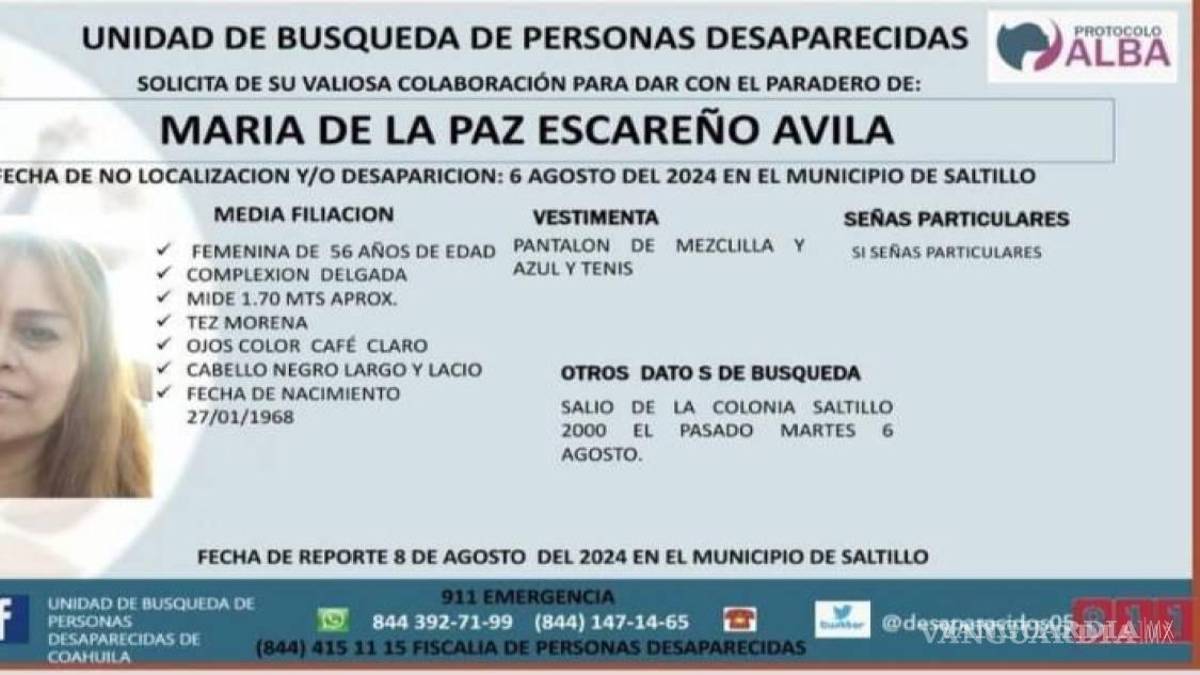 De acuerdo con el Fiscal General del Estado, los restos pertenecen a María de la Paz Escareño, quien había sido buscada por su familia desde el 6 de agosto, luego de ser vista por última vez antes de dirigirse a la colonia Saltillo 2000 para cobrar un préstamo a un cliente.