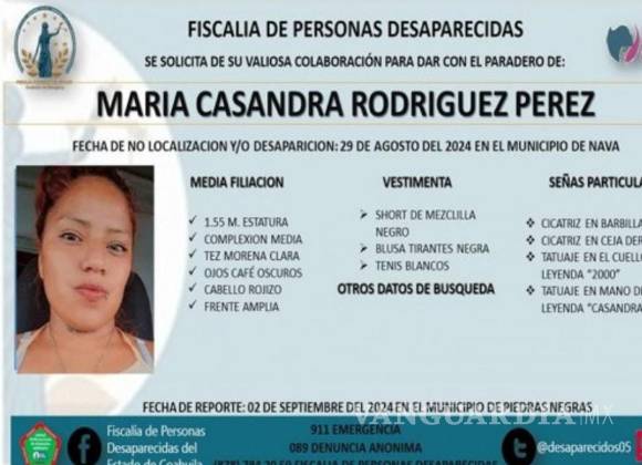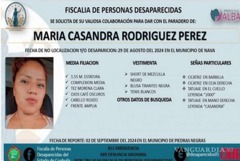 La desaparición de María Casandra Rodríguez Pérez, vista por última vez el 29 de agosto en el municipio de Nava, ha puesto en marcha una intensa búsqueda por parte de la Fiscalía General del Estado de Coahuila. La Unidad Especializada en Personas No Localizadas está al frente de las investigaciones, y no se descarta la posibilidad de que la joven se encuentre fuera del estado.