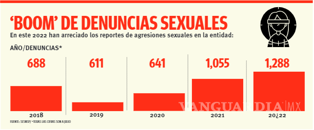 Las denuncias por violencia sexual en el Estado se dispararon 22 por ciento en comparación con los primeros siete meses del año pasado, con lo cual avanzan a un ritmo récord.