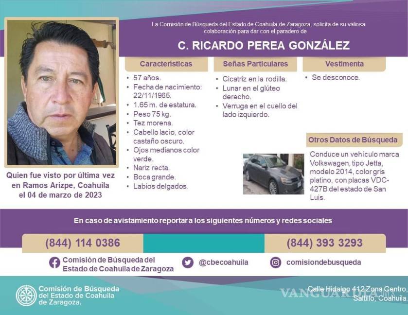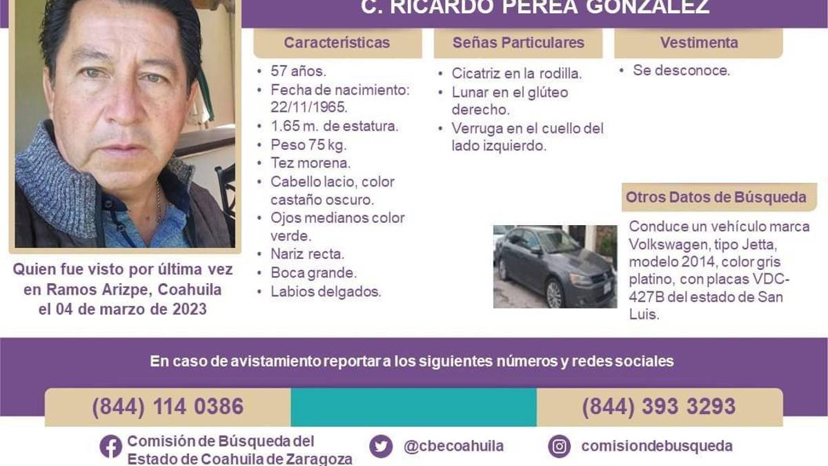 De acuerdo con la ficha de búsqueda de la Fiscalía de Personas Desaparecidas del Estado de Coahuila, Perea González, de 57 años, conducía un vehículo Jetta 2014 color gris, con placas VDC427B de San Luis Potosí.