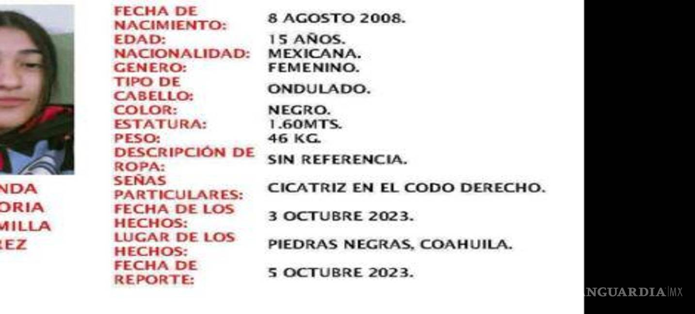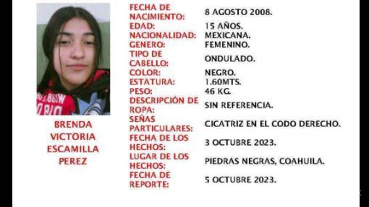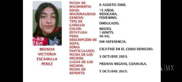 PIEDRAS NEGRAS, COAHUILA.- La ciudad de Piedras Negras se encuentra conmocionada por la desaparición de Brenda Victoria Escamilla Pérez, una adolescente de 15 años que fue reportada como desaparecida por su familia. Según los informes, la joven salió de su hogar en la colonia Año 2000 el pasado 3 de octubre y desde entonces no ha habido noticias de su paradero.