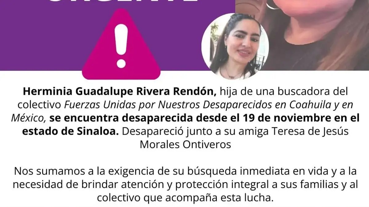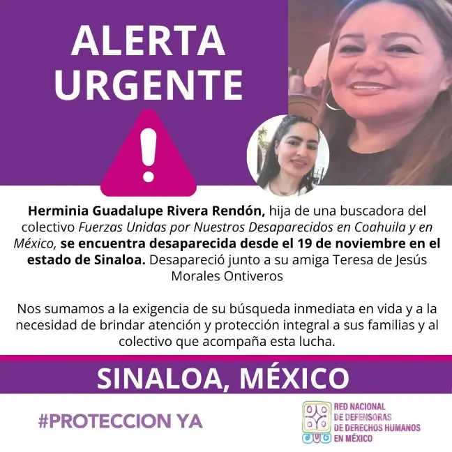“Hoy, después de 16 años, denunciamos que justo hace un mes desaparecieron dos mujeres en Mazatlán, Sinaloa: Teresa de Jesús Morales Ontiveros y Herminia Guadalupe Rivera Rendón, una de ellas hija de nuestra compañera del colectivo. La historia se vuelve a repetir para ella y existe el terror de que se repita para más familias que ya lo vivimos. ¿Dónde están las medidas de Prevención? ¿Dónde están las medidas de no repetición? ¿Dónde la verdad y la justicia? ¡No más personas desaparecidas!”, señalaron en un comunicado.