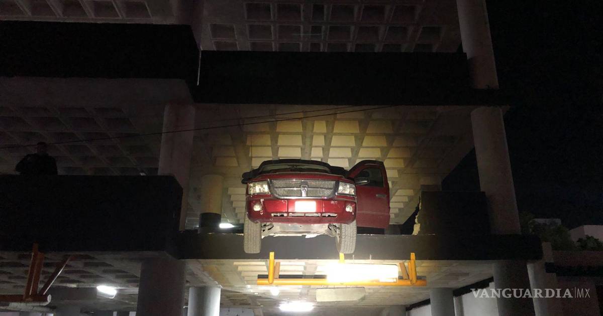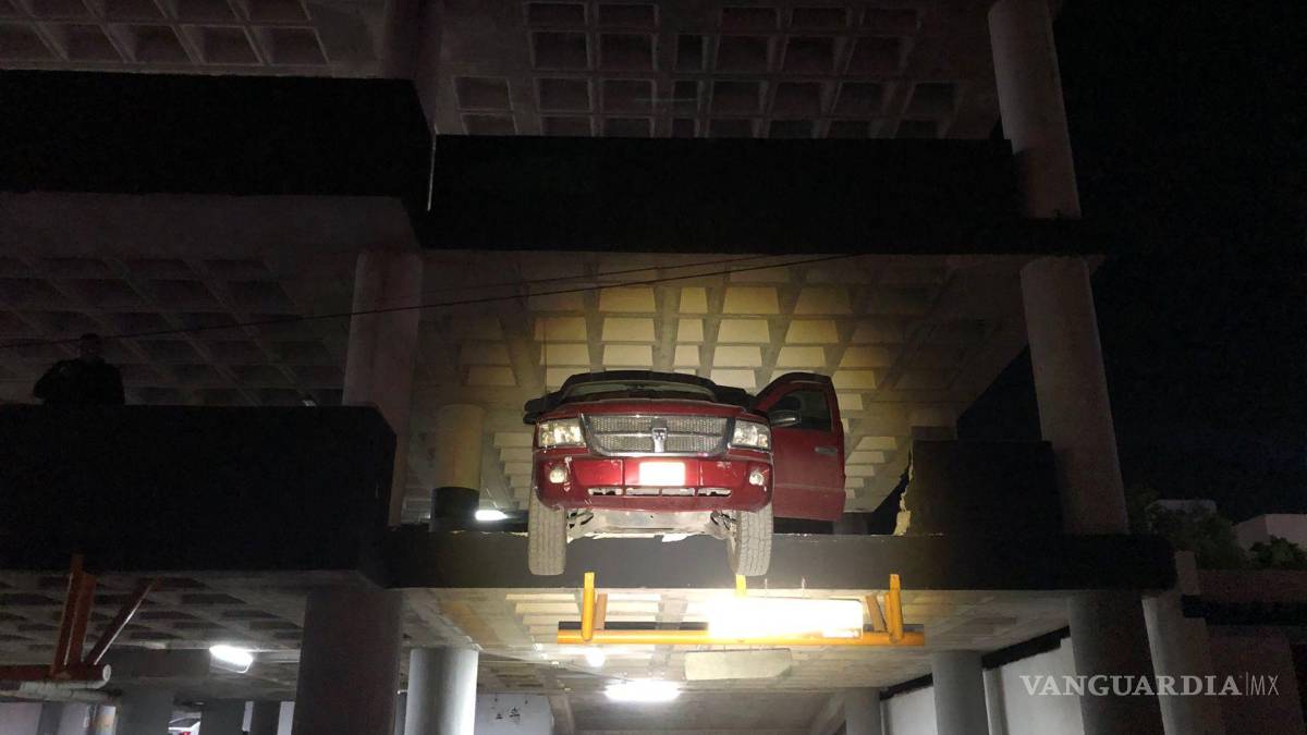 El conductor de una camioneta pick-up de la marca Dodge estuvo a punto de caer desde el segundo piso de un estacionamiento al norte de Saltillo, pues tras colisionar contra un muro lo derribó y quedó con las dos llantas delanteras al aire.