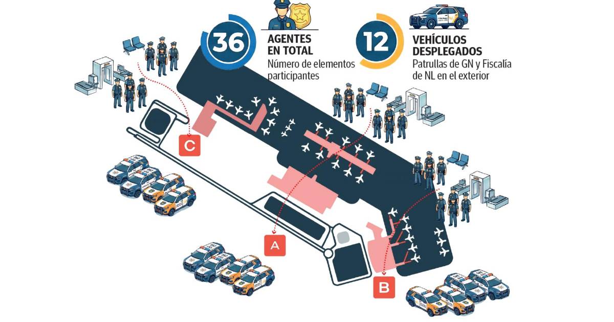 Si se consideran equipos similares, en las tres terminales del aeropuerto de Monterrey, tanto en los filtros de seguridad como en las salas de última espera, ello implicaría la participación de al menos 24 agentes desplegados dentro de la terminal aérea.
