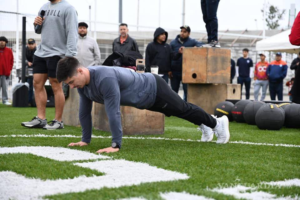 ACUÑA, COAH.- Con la recomendación de trabajar muy duro, fijarse metas grandes y perseguirlas, porque son posibles, los atletas Jorge Fernández, campeón en equipos de los Bulls Crossfit Games 2023, y Roldan Goldbaum, atleta mexicano mejor evaluado en crossfit, ofrecieron una exhibición de este deporte y convivieron con deportistas de gimnasios locales.
