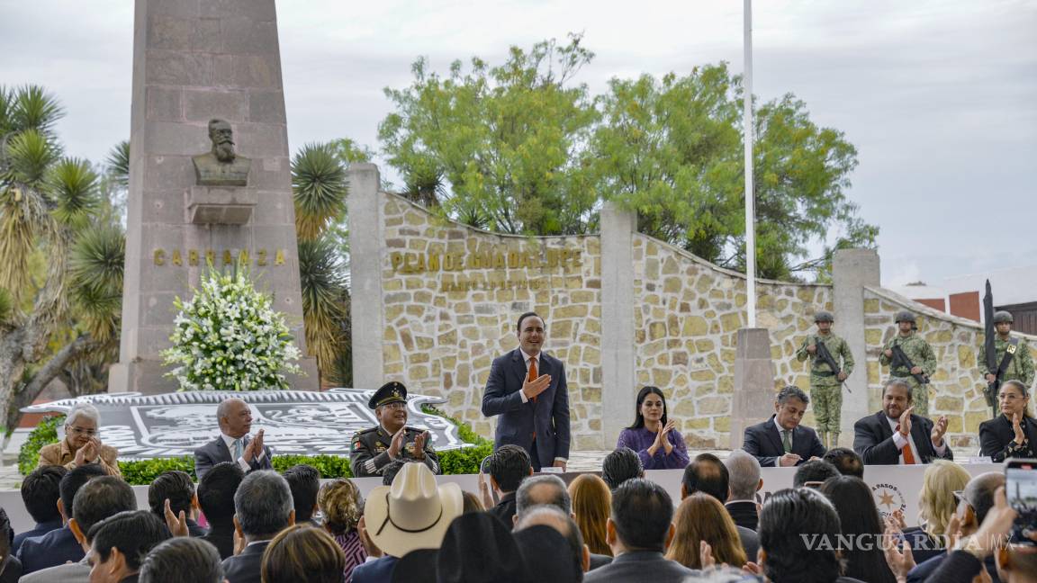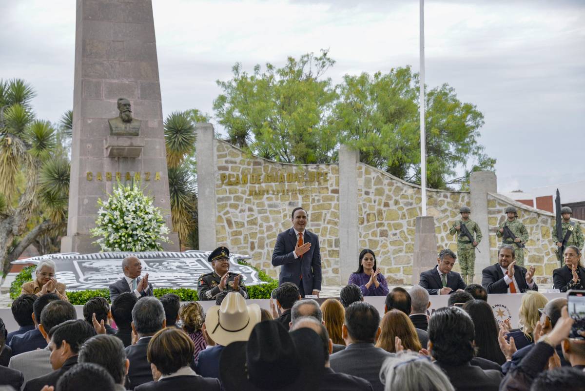 “Desde Ramos Arizpe, conmemoramos el 112 aniversario de la firma del Plan de Guadalupe, un hecho histórico encabezado por Venustiano Carranza que sentó las bases del México democrático y constitucional. Aquí en Coahuila siempre hemos sido valientes, echados pa’ delante y firmes en la lucha por un país mejor. Hoy seguimos honrando ese legado con trabajo, unión y compromiso”, destacó el gobernador.