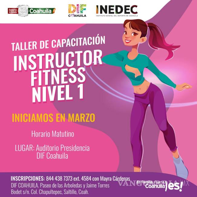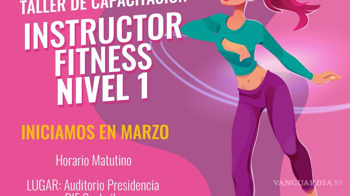 El Taller de Capacitación para Instructor de Fitness Nivel 1, en Saltillo, tendrá una duración de un mes con sesiones los martes y viernes de las 10:00 a las 13:00 horas, en el Auditorio de Presidencia del DIF Coahuila, ubicado en la calle Paseo de las Arboledas, sin número, en la colonia Chapultepec.