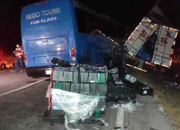 Torreón, Coahuila. - Un autobús de turismo que llevaba pasajeros con rumbo a Mazatlán, chocó por alcance contra un tráiler cargado de piezas automotrices de aluminio, dejando como saldo dos muertos y 14 lesionados en la carretera federal Torreón-Saltillo a la altura del entronque del ejido El Sol, municipio de Parras, Coahuila.