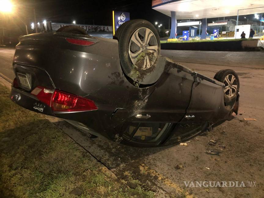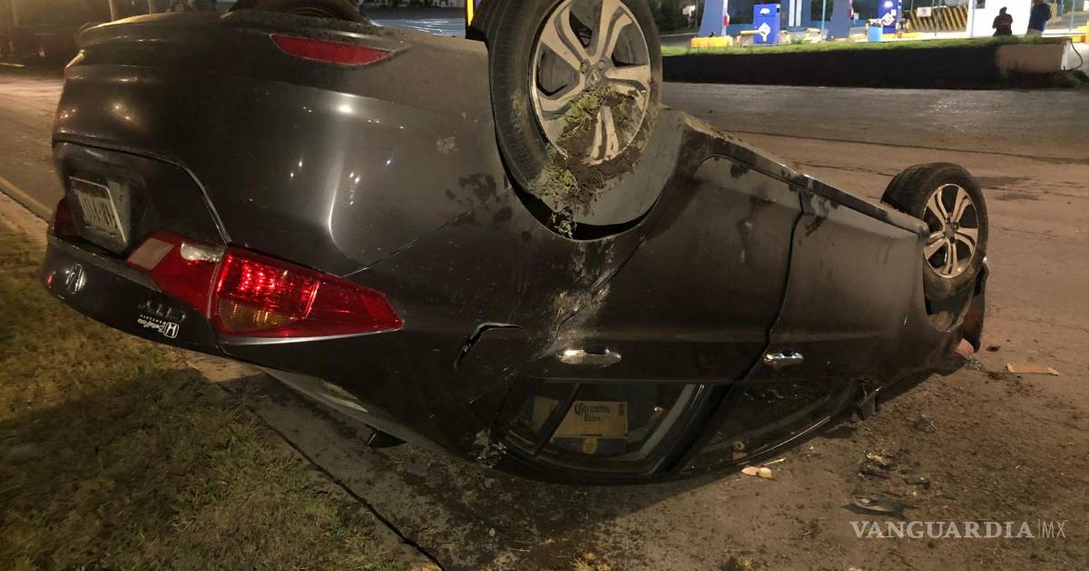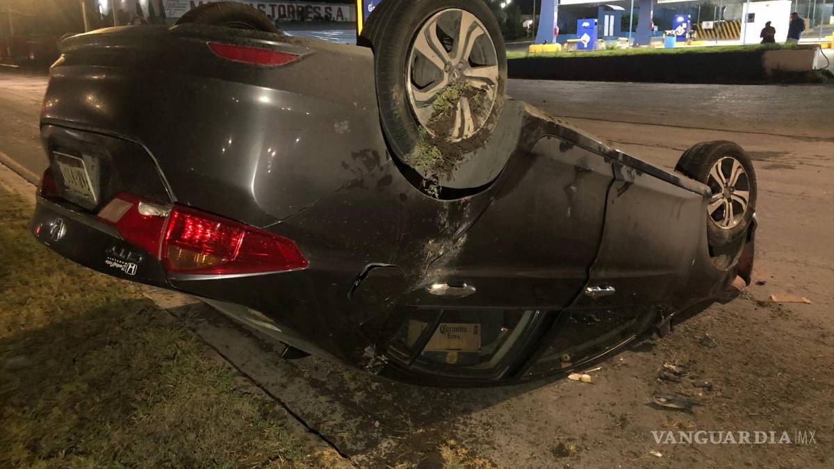 Recostado sobre su costado derecho, terminó un vehículo de la marca Honda, cuyo conductor, presuntamente bajo los efectos del alcohol, perdió el control al intentar tomar una salida sobre el bulevar Fundadores, al oriente de Saltillo.